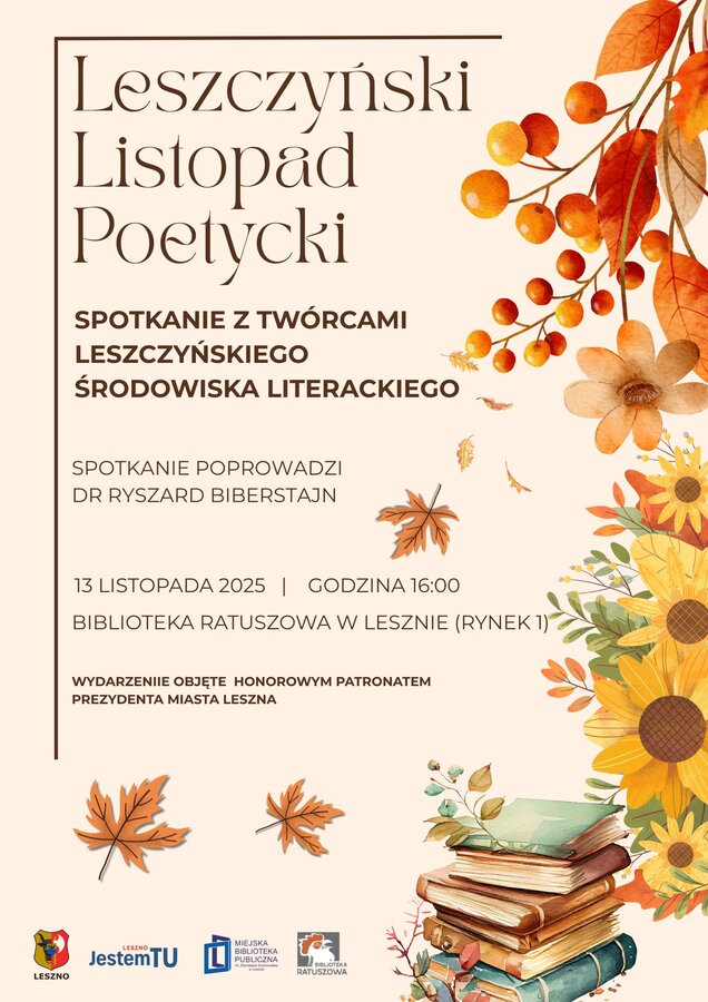 W czwartek 13 listopada 2025 roku o godzinie 16:00 w Bibliotece Ratuszowej w Lesznie (Rynek 1) odbędzie się spotkanie z twórcami leszczyńskiego środowiska literackiego. To wyjątkowa okazja, by poznać autorów związanych z Lesznem i Ziemią Leszczyńską, posłuchać ich poezji, refleksji o pisaniu oraz rozmowy o roli słowa w dzisiejszym świecie.