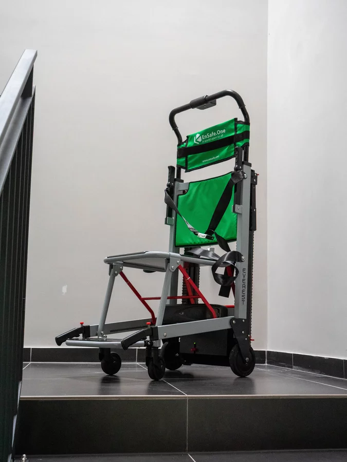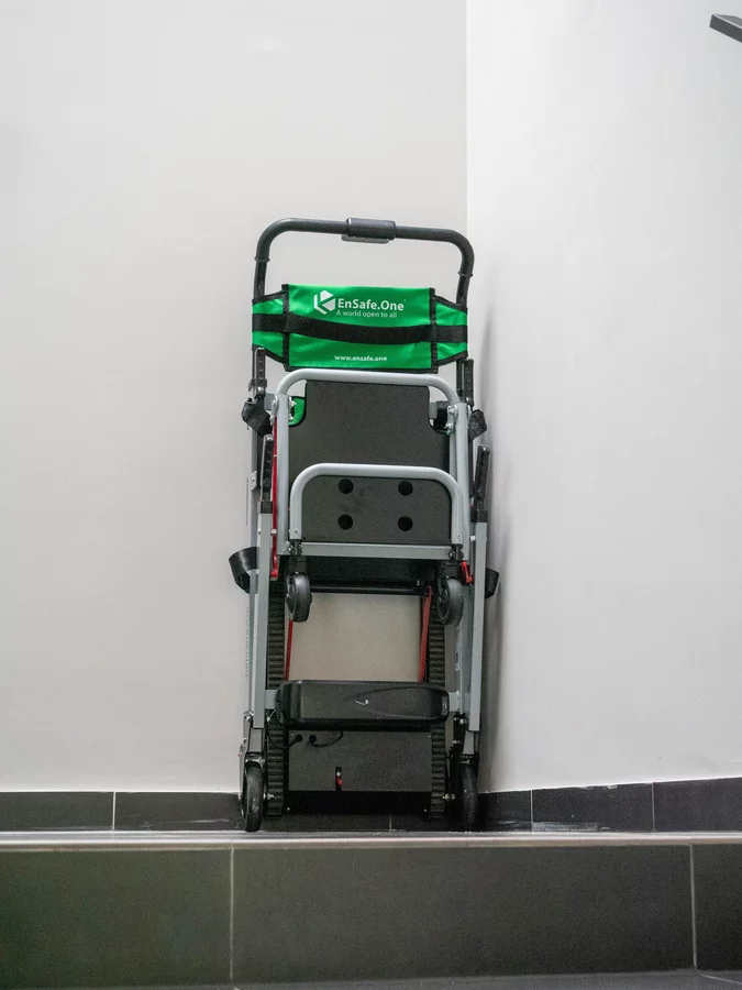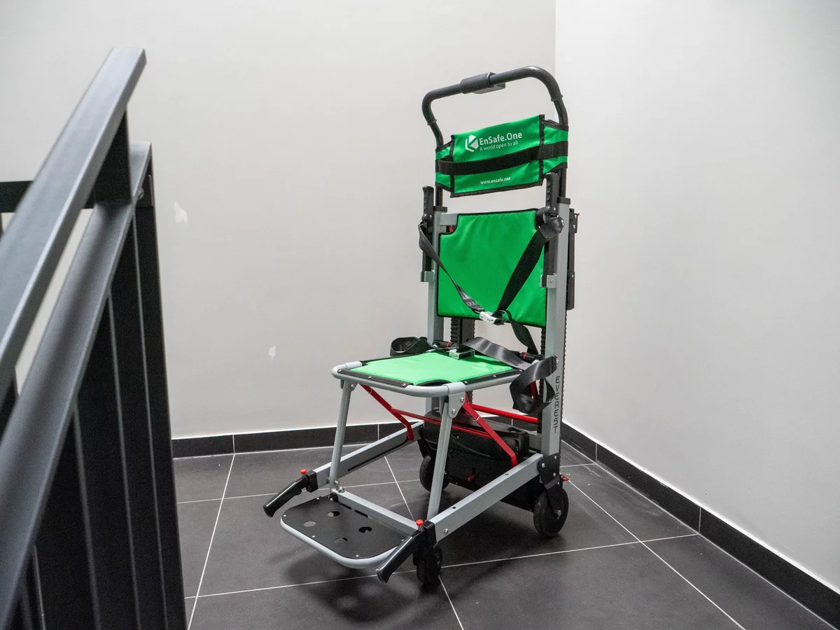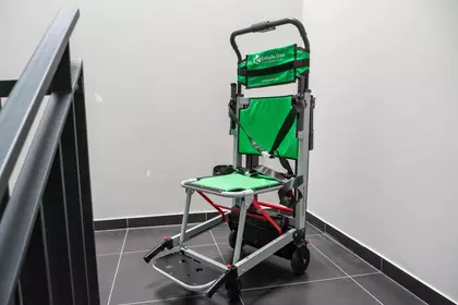 Krzesła zostały zamontowane przy klatkach schodowych i są gotowe do użycia w sytuacjach awaryjnych - ich obsługa jest intuicyjna, a konstrukcja umożliwia szybkie i bezpieczne sprowadzenie osoby po schodach. To kolejny krok w stronę dostępnej i świadomie zaprojektowanej przestrzeni.
