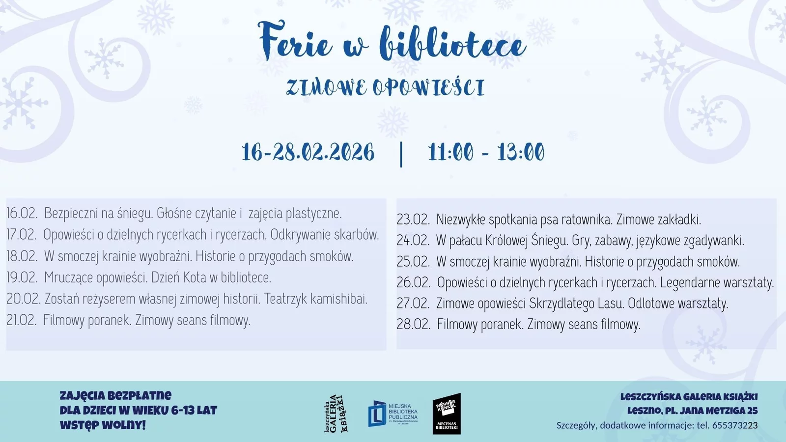 Od 16 do 28 lutego 2026 roku, codziennie w godz. 11:00-13:00, Leszczyńska Galeria Książki w Lesznie przy placu Jana Metziga 25 zaprasza dzieci w wieku 6-13 lat na bezpłatne zajęcia pełne historii, zabawy i twórczych działań.