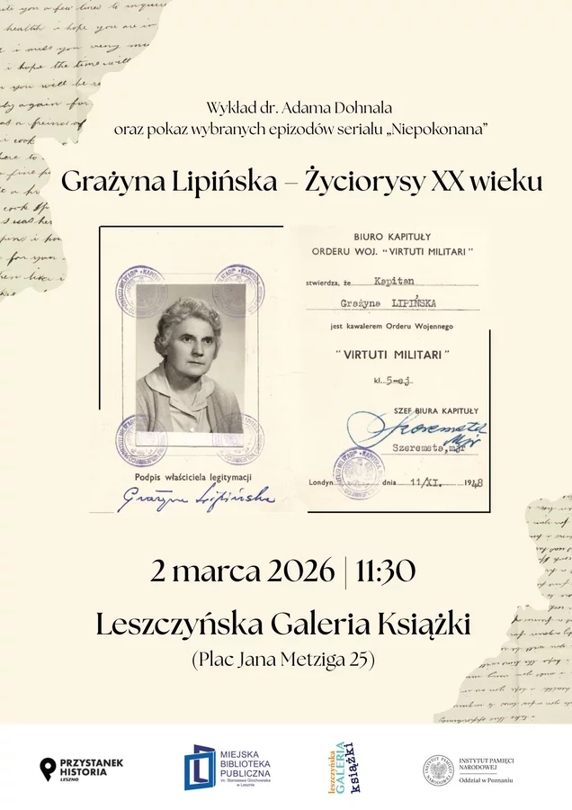 2 marca o godzinie 11:30 odbędzie się wykład połączony z pokazem wybranych odcinków serialu "Grażyna Lipińska - Niepokonana". Wydarzenia odbędzie się w Przystanku Historia - Leszno, w budynku Miejskiej Biblioteki Publicznej im. Stanisława Grochowiaka - Leszczyńskiej Galerii Książki (Pl. Jana Metziga 25, 64-100 Leszno).