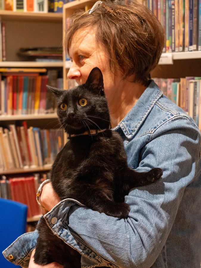 A prawdziwy kot? Owszem, pojawił się. Przechadzał się między półkami z godnością stałego bywalca, jakby sprawdzał, czy wszystko jest na swoim miejscu. Trudno było o lepszego gospodarza tego spotkania.