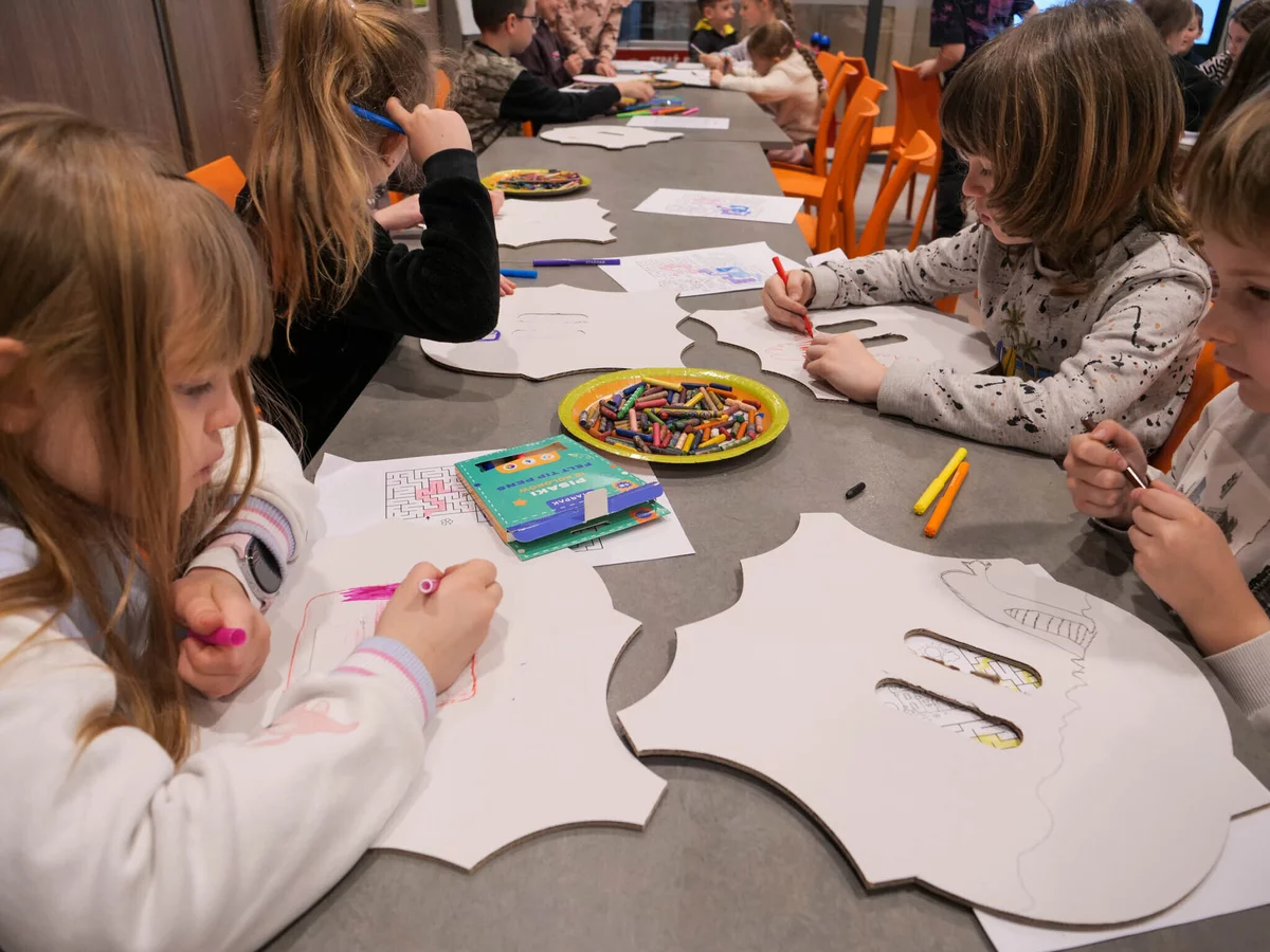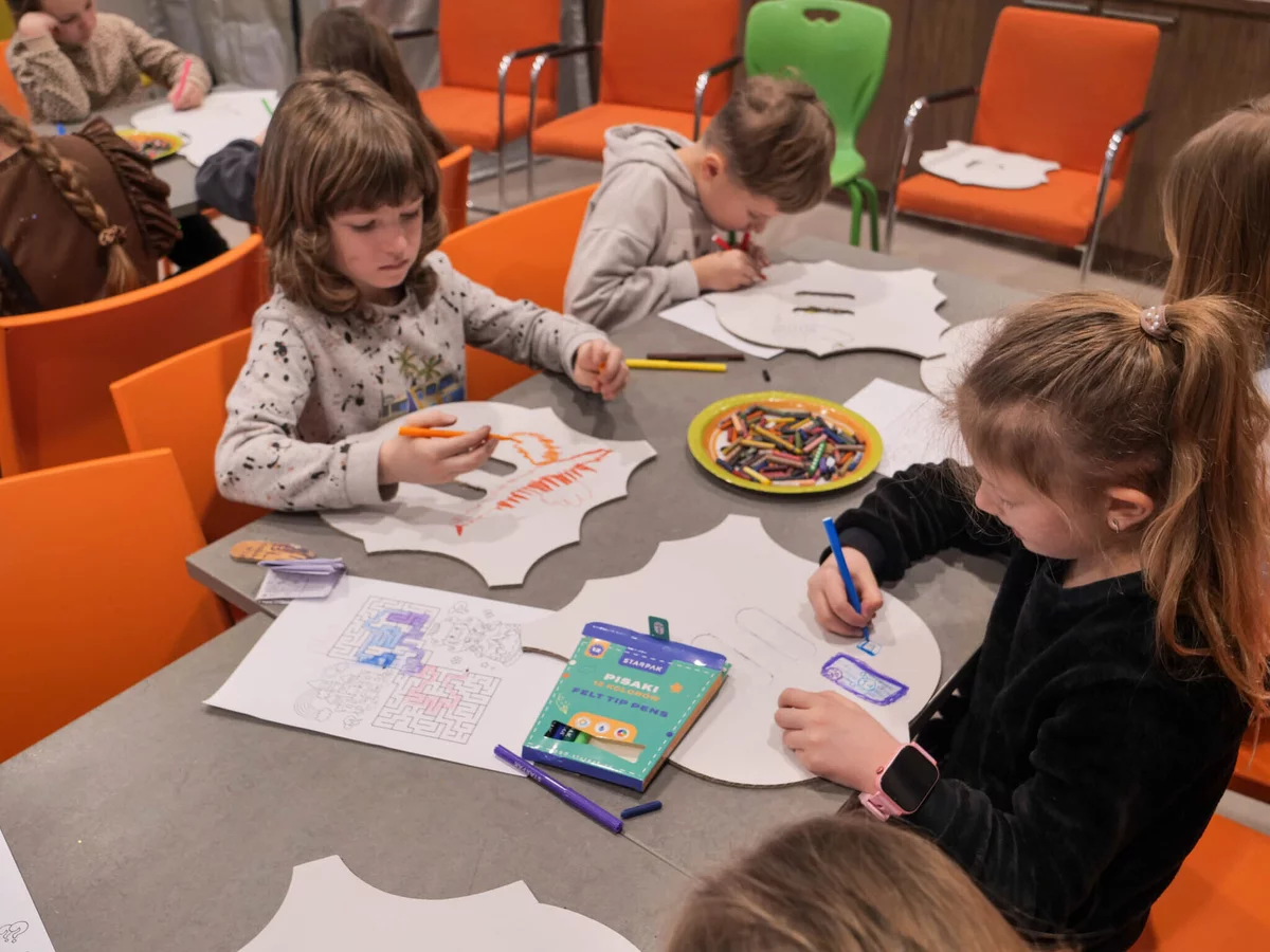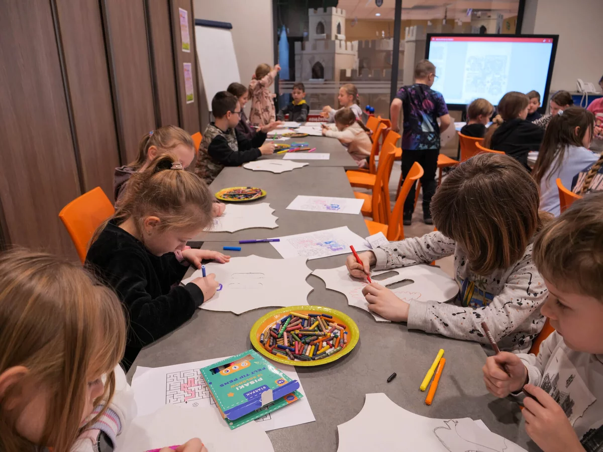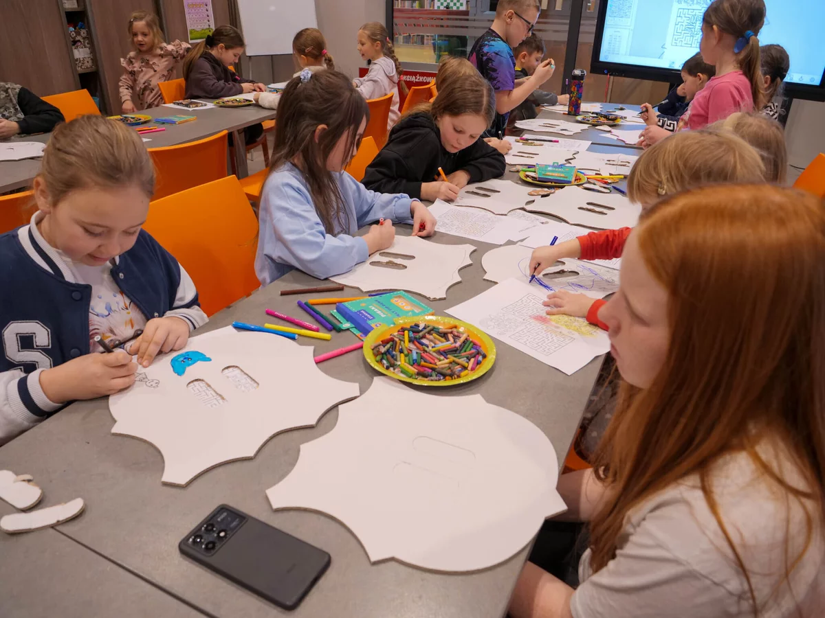 Po części czytelniczej przyszedł czas na warsztaty plastyczne. Uczestnicy ozdabiali własne rycerskie tarcze, projektując herby i symbole, które najlepiej oddawały ich charakter. Nie zabrakło smoków, błyskawic, serc i całkiem poważnych znaków bojowych. Każda tarcza była inna, a wyobraźnia pracowała szybciej niż niejeden średniowieczny koń bojowy.
