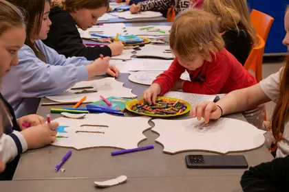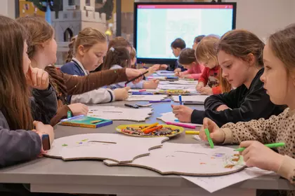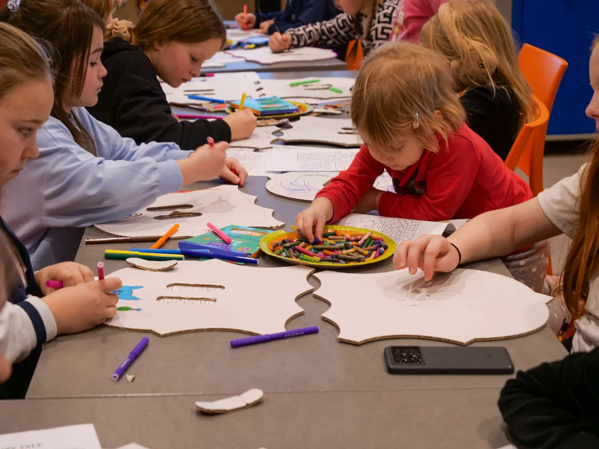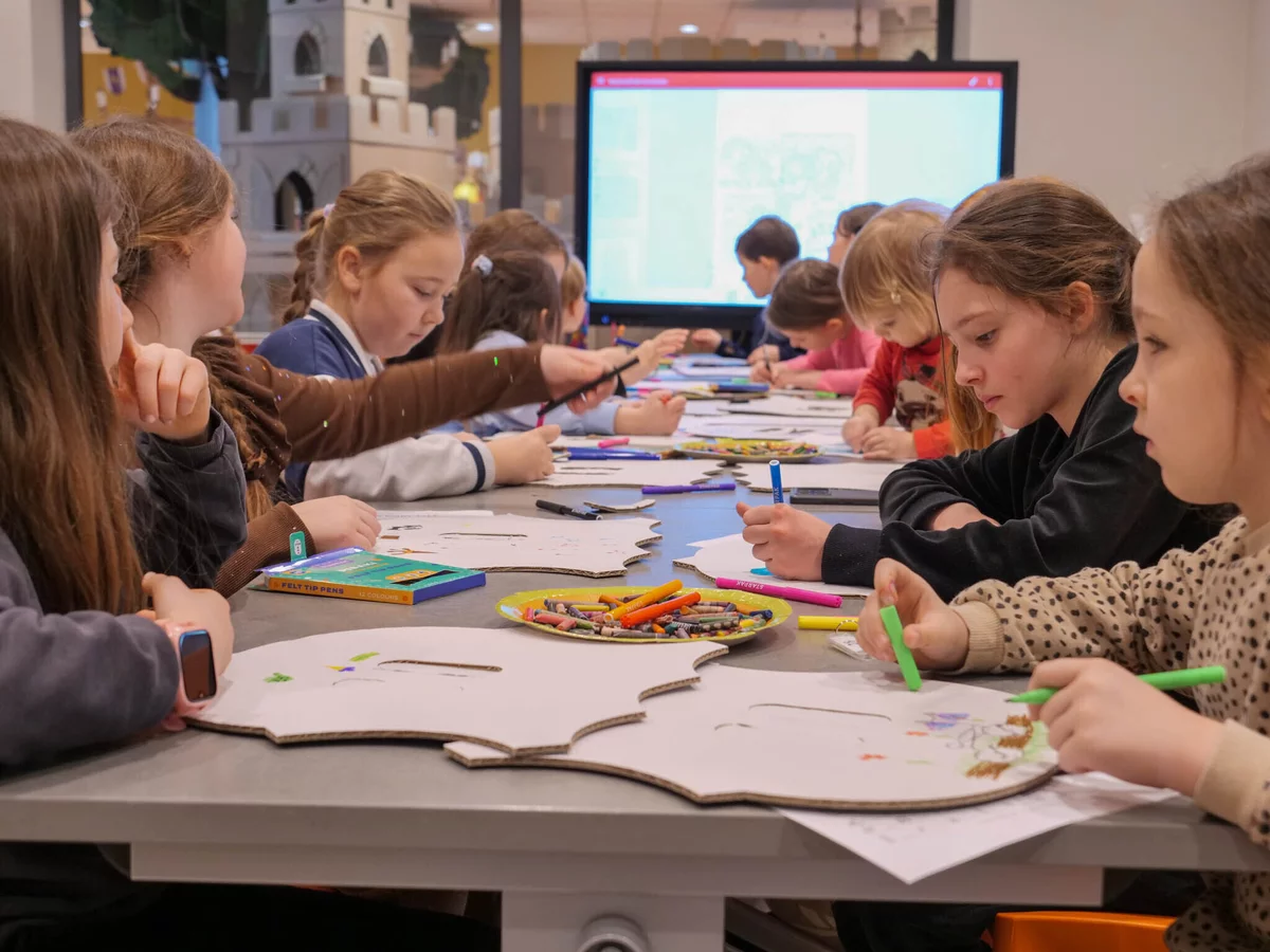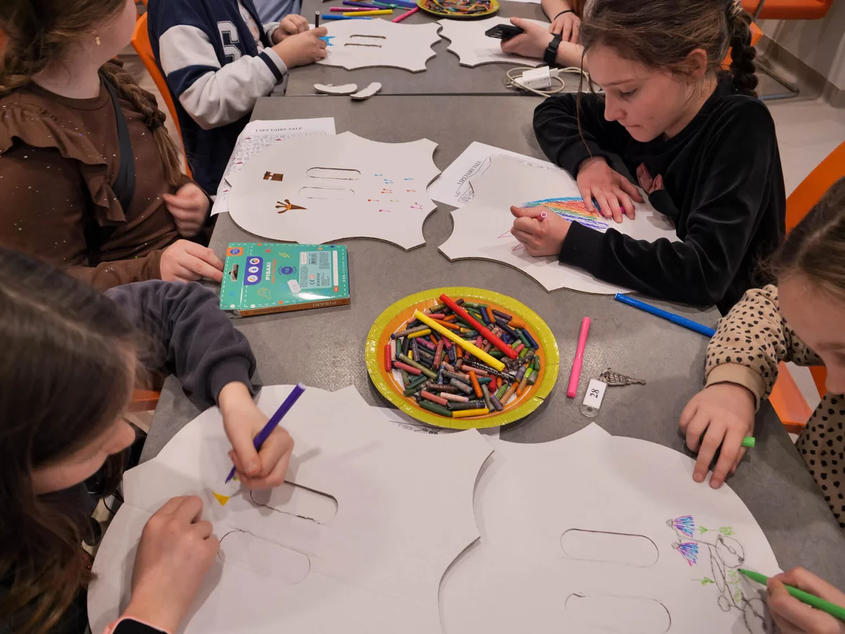 Po części czytelniczej przyszedł czas na warsztaty plastyczne. Uczestnicy ozdabiali własne rycerskie tarcze, projektując herby i symbole, które najlepiej oddawały ich charakter. Nie zabrakło smoków, błyskawic, serc i całkiem poważnych znaków bojowych. Każda tarcza była inna, a wyobraźnia pracowała szybciej niż niejeden średniowieczny koń bojowy.