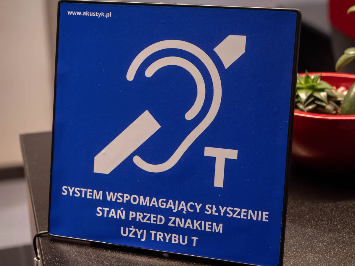 Pętla indukcyjna eliminuje zakłócenia dźwiękowe i pozwala osobom z aparatami słuchowymi odbierać czysty dźwięk bezpośrednio w uchu. To niewidoczne na pierwszy rzut oka rozwiązanie, które robi ogromną różnicę.