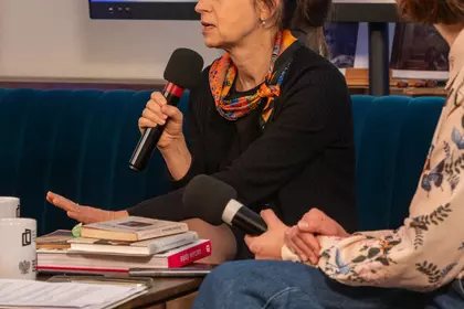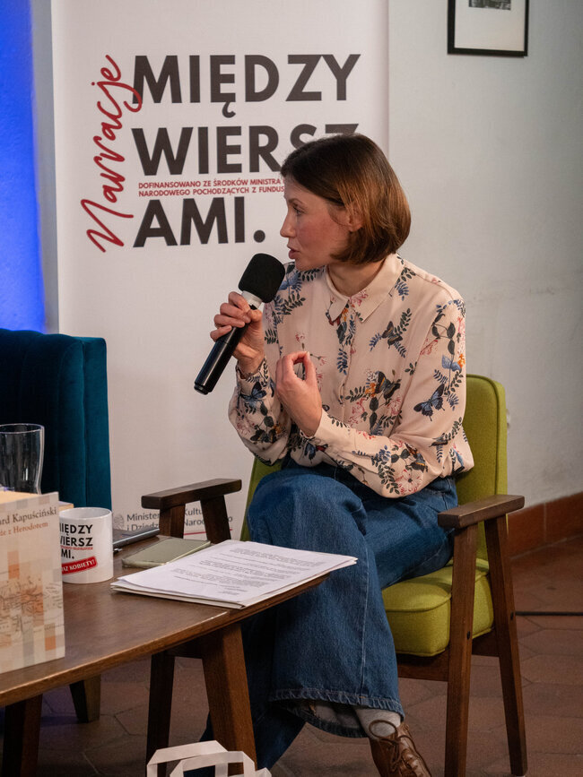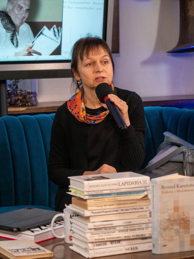 Urszula Glensk mówiła o Kapuścińskim jako o humaniście i uważnym obserwatorze, który potrafił z fragmentów ludzkich historii budować opowieści o wielkich przemianach. Przybliżyła także własne doświadczenia badawcze - od monumentalnej Historii słabych, przez Hirszfeldów, po najnowszą Pinezkę, w której dokumentuje dramatyczną codzienność migracyjnego pogranicza.