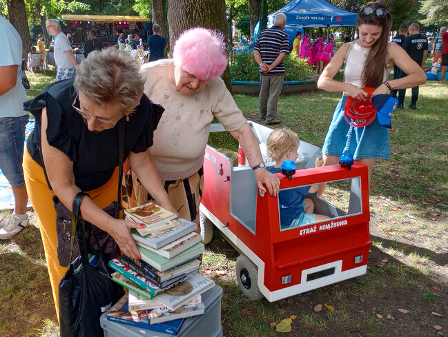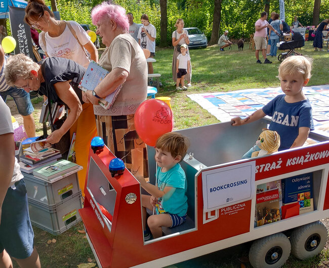 Nie zabrakło też słynnej Straży Książkowej – pojazdu bibliotecznego, który dostarczył książki w ramach bookcrossingu kulinarnego „Daj gryza, czyli smakowite historie”, a także był tłem do zdjęć i wielką frajdą dla dzieci.