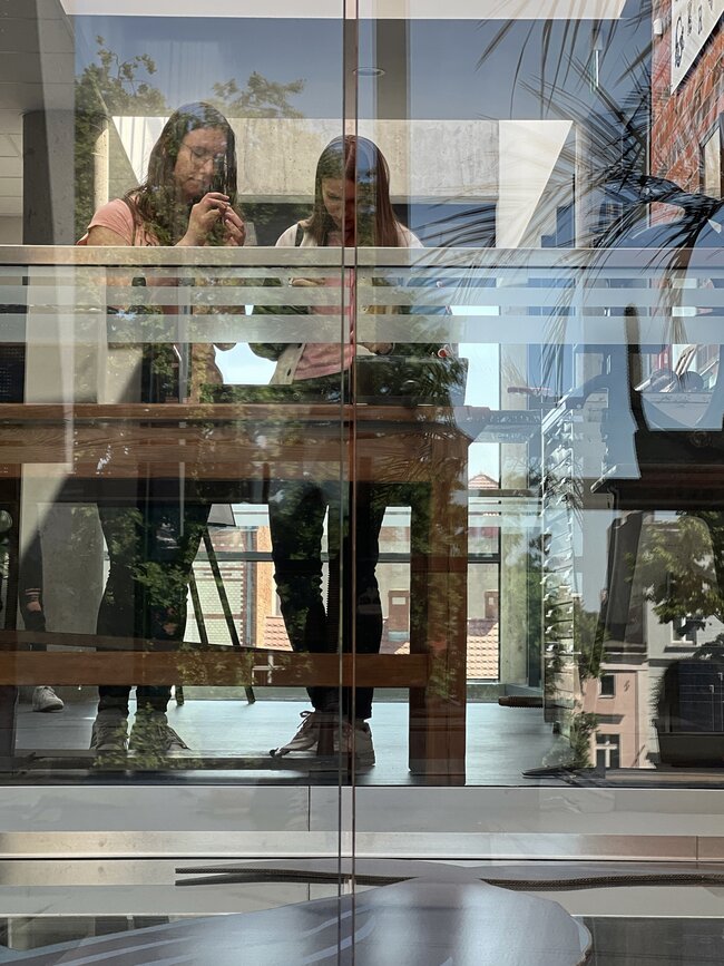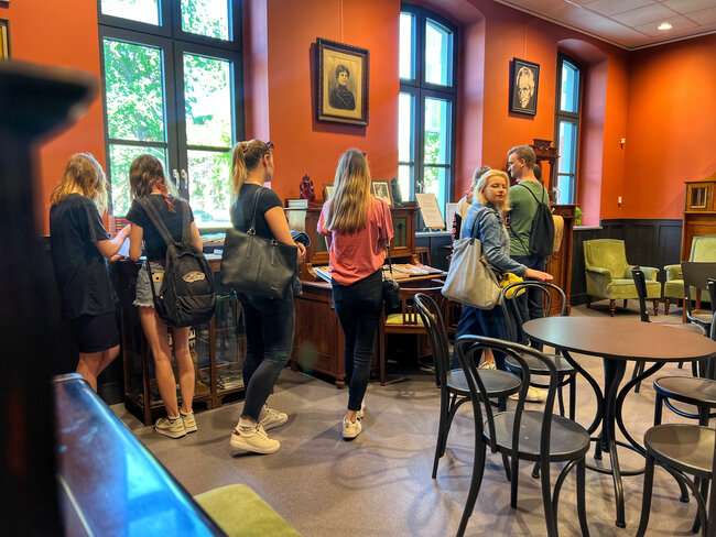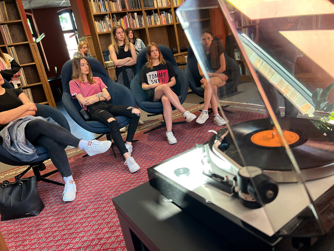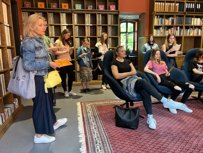Mimo że nowa siedziba biblioteki została udostępniona dla mieszkańców już prawie rok temu, to kilka razy w miesiącu pojawiają się u nas kolejne grupy, które chcą zwiedzić Leszczyńską Galerię Książki. Dzisiaj (1 czerwca 2023 r.) gościliśmy uczniów Zespołu Szkół Ekonomicznych w Lesznie. Piękne wnętrza pokazał i o multimedialnych właściwościach, bogatych zbiorach i nowych możliwościach opowiadał Paweł z Działu Edukacji oraz Ewa z Działu Informacyjno-Bibliograficznego.