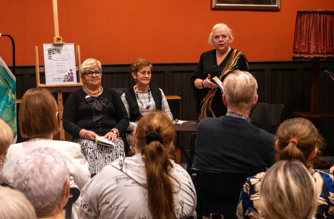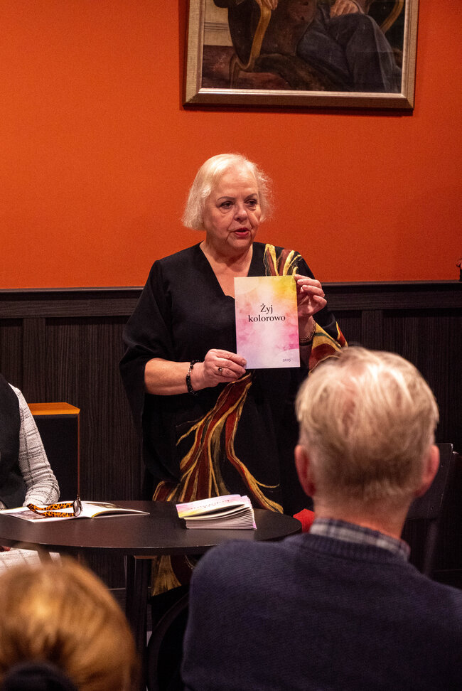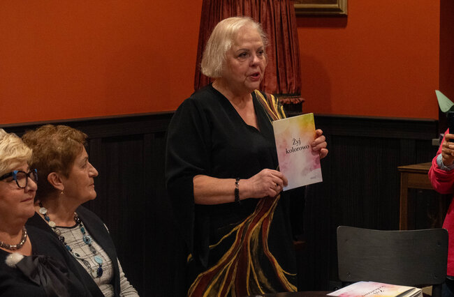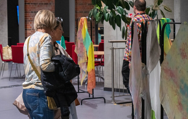 Na wystawie można było podziwiać barwne, niepowtarzalne prace wykonane na jedwabiu – delikatnym materiale, który wymaga zarówno precyzji, jak i wyczucia koloru. Uczestnicy spotkania mieli również okazję poznać publikację „Żyj kolorowo”, stanowiącą inspirację do poszukiwania w sztuce radości, spokoju i codziennej motywacji do działania.