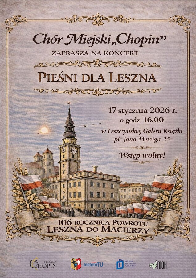 Serdecznie zapraszamy na koncert „Pieśni dla Leszna” z okazji 106. rocznicy powrotu Leszna do Macierzy w wykonaniu Chóru Miejskiego „Chopin”. Na wydarzenie zapraszamy w sobotę, 17 stycznia 2026 roku o godz. 16:00 do Leszczyńskiej Galerii Książki (pl. Jana Metziga 25). Wstęp wolny.