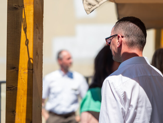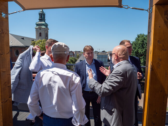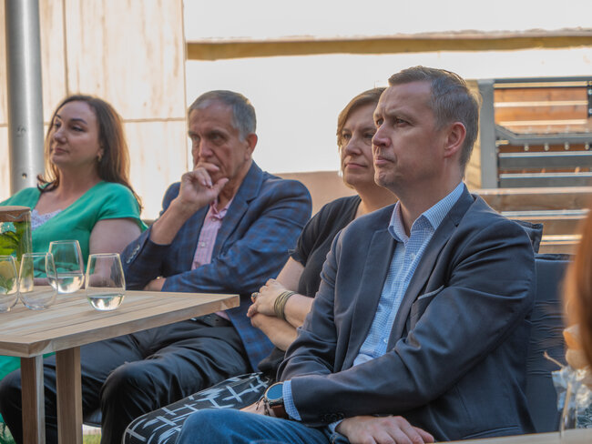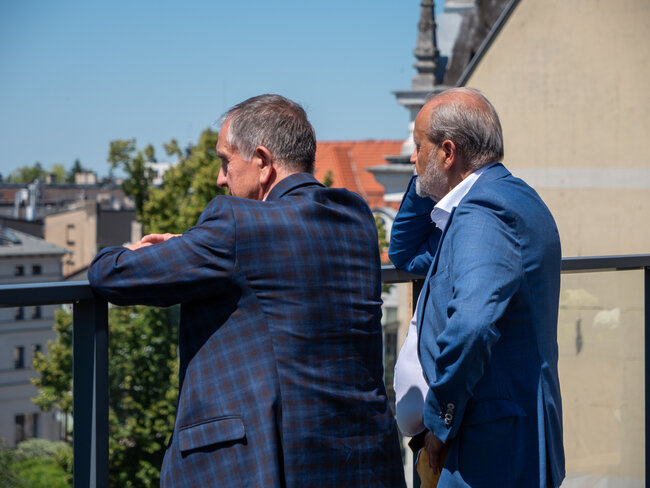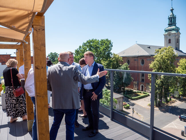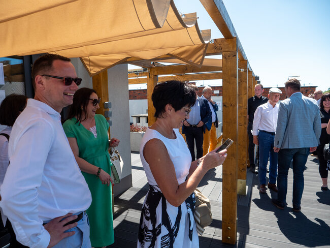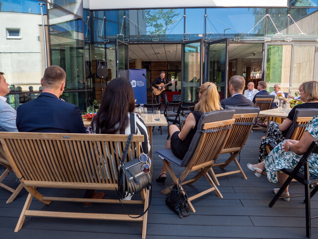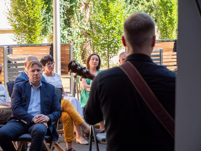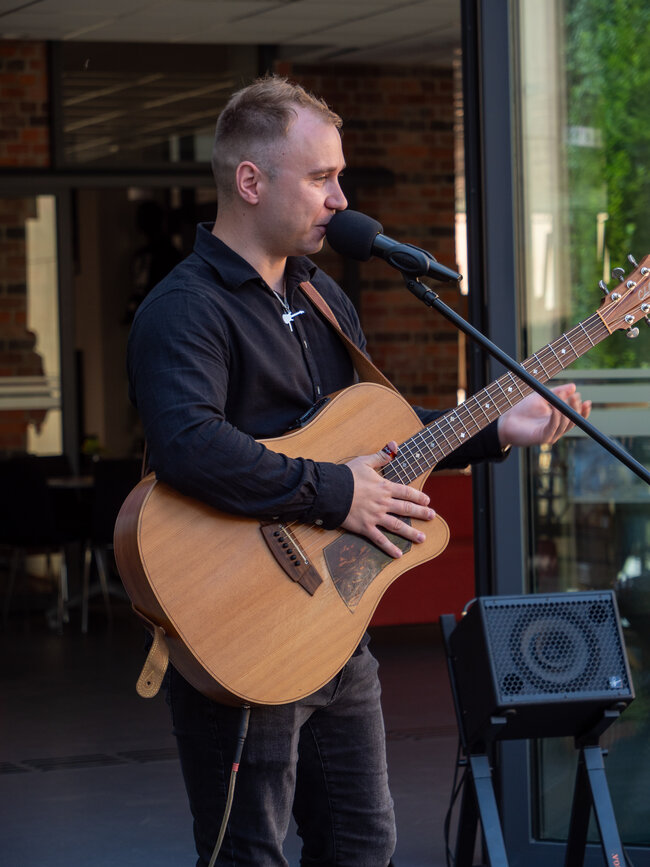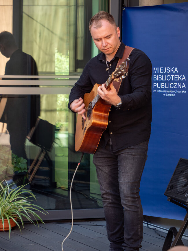 Zanim jednak wszyscy udali się zwiedzić nową przestrzeń na dachu, na patio biblioteki odbył się kameralny koncert gitarowy w wykonaniu Wojciecha Frąckowiaka, który swoją muzyką uświetnił całe wydarzenie i nadał mu wyjątkowy klimat.