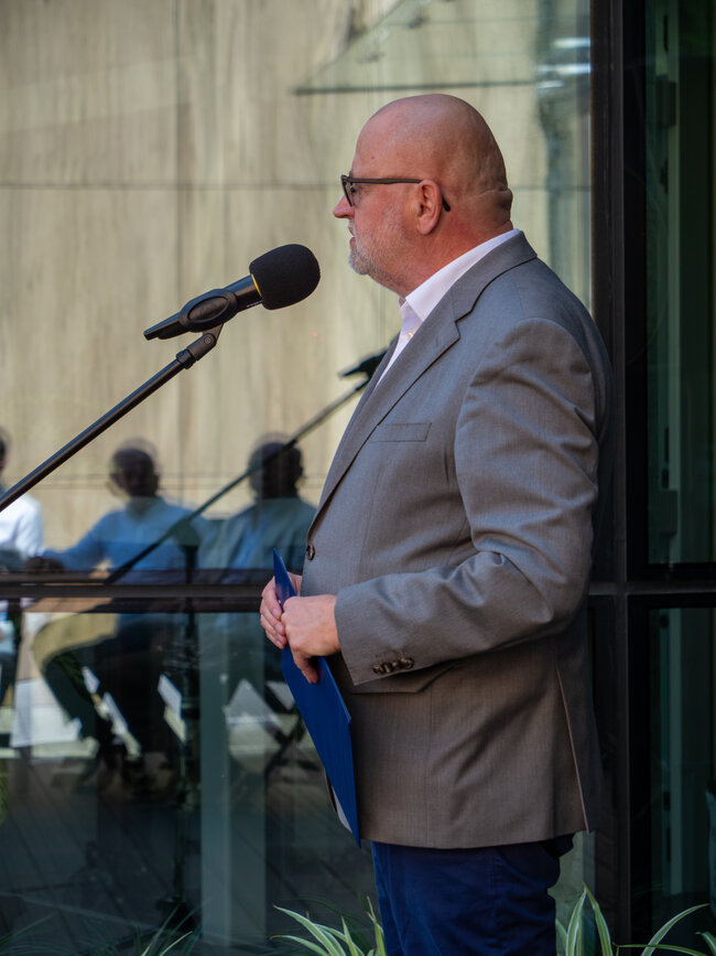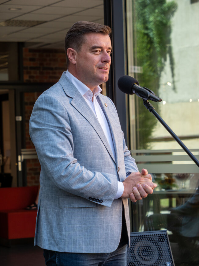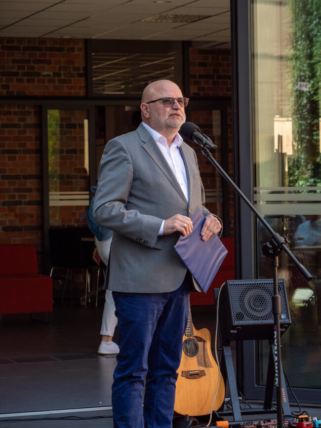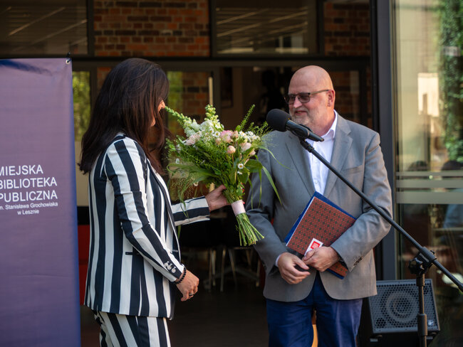 Oficjalną część wydarzenia rozpoczął dyrektor Miejskiej Biblioteki Publicznej im. Stanisława Grochowiaka w Lesznie – Andrzej Kuźmiński, który powitał wszystkich przybyłych, podziękował za obecność i wsparcie oraz opowiedział o genezie i idei projektu. Zwrócił uwagę, jak ważne jest tworzenie nowoczesnej i przyjaznej infrastruktury bibliotecznej, która służy całej społeczności.